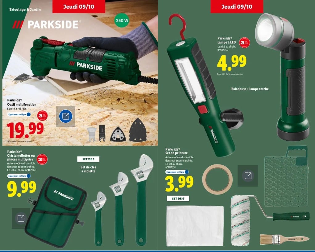 Découvrez l’outil multifonction Parkside, idéal pour tous vos projets de bricolage. Avec une puissance de 250 W, cet appareil est parfait pour les travaux de précision. Il est livré avec plusieurs accessoires pour s’adapter à toutes vos tâches. Cet outil est proposé au prix attractif de 19,99 €, disponible dès le jeudi 09/10.
