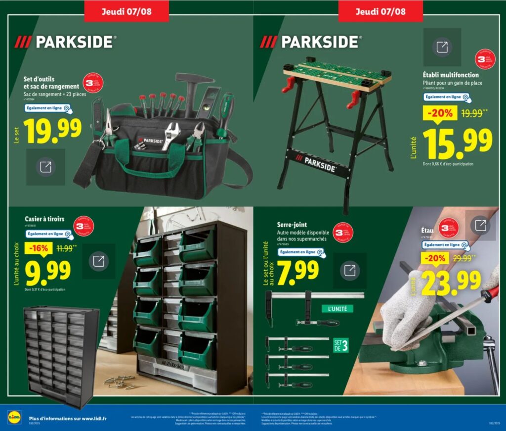 Le set d’outils Parkside est idéal pour les bricoleurs recherchant fonctionnalité et organisation. Il est accompagné d’un sac de rangement robuste et comprend 23 pièces essentielles. Ce set est parfait pour garder vos outils à portée de main pendant vos projets de bricolage. Disponible à un prix attractif de 19,99€, il allie qualité et praticité.