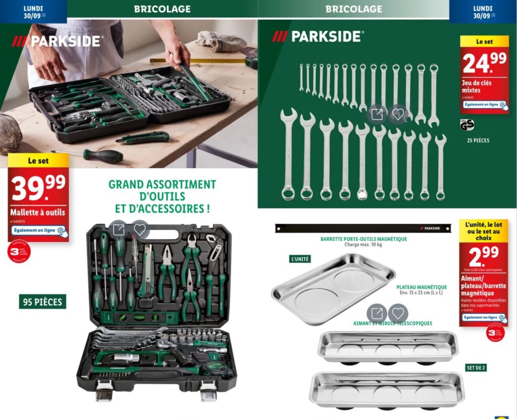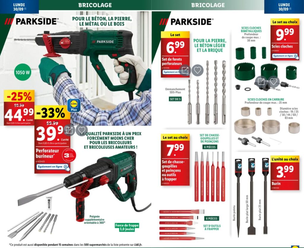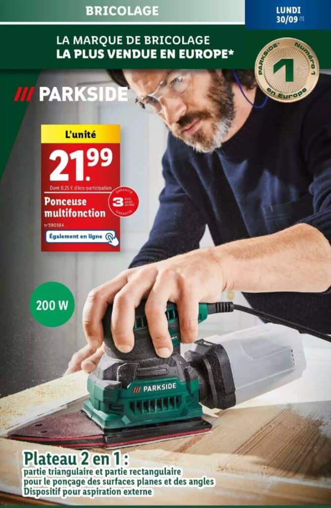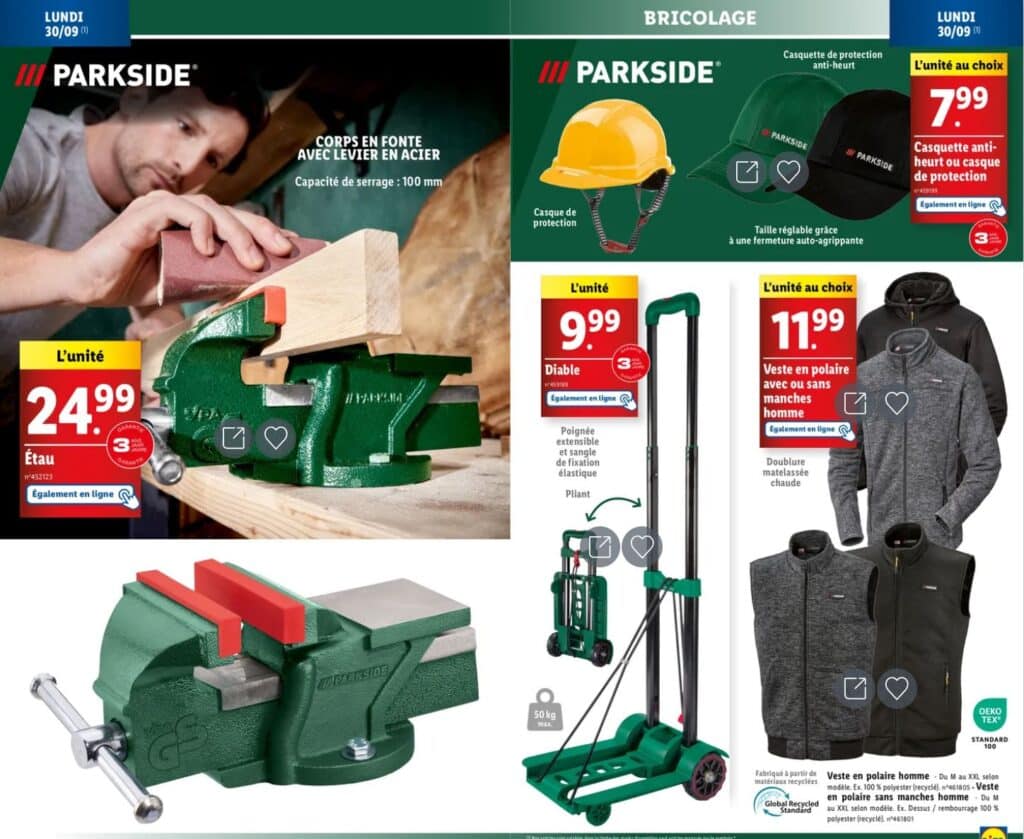 Cette semaine chez Lidl, c’est 10 pages de promos sur l’arrivage Parkside. Découvrez dès le 30 septembre une sélection d’outils et accessoires pour bricoleurs, disponibles exclusivement en ligne. Voici les détails des produits phares de cette semaine :