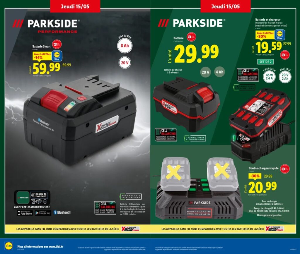 Profitez de l’ensemble Batterie et Chargeur Parkside pour une solution complète et économique. Ce set comprend une batterie de 20 V 2 Ah avec un chargeur efficace de 65 W 2,4 A. Grâce à l’offre Lidl Plus, obtenez ce dispositif à 19,59€ au lieu de 27,99€. Une occasion à ne pas manquer pour améliorer votre équipement.