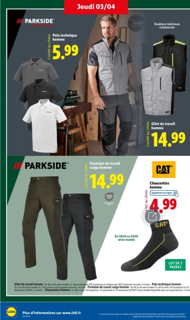 Les chaussettes homme CAT offrent un confort exceptionnel et sont disponibles du 39/42 au 43/46. Vendues en lot de trois paires pour 4,99€, elles assurent une utilisation durable et confortable. Ces chaussettes sont également disponibles à l’achat en ligne, facilitant ainsi votre approvisionnement en articles essentiels.