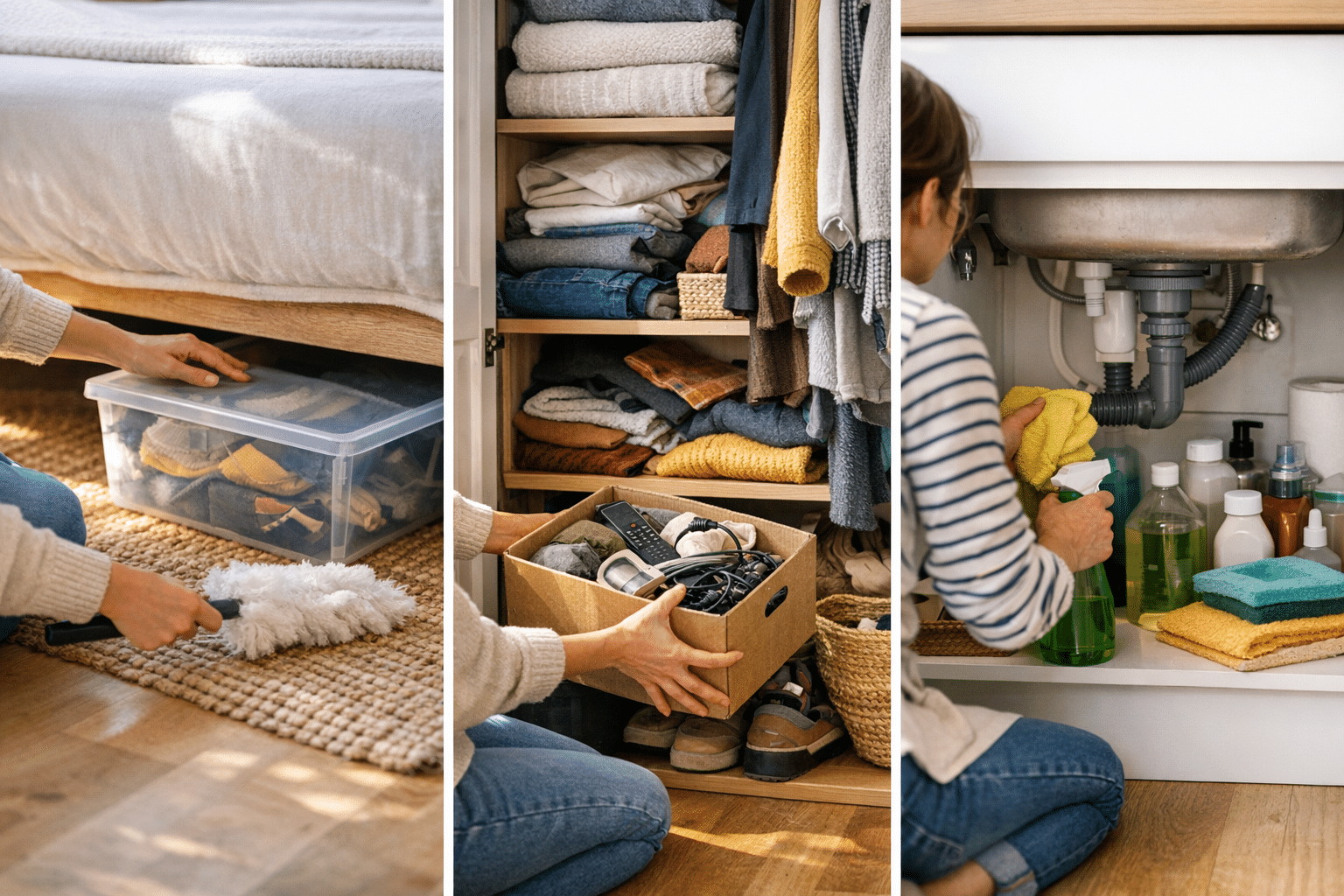 Commencez par ces trois zones clés – entrée, cuisine, chambre – puis poursuivez, si vous en avez le courage, avec la salle de bains, le garage ou la cave. L’important est d’y aller étape par étape, à votre rythme.