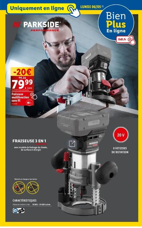 Découvrez la Fraisseuse Multifonction Sans Fil Parkside à 79,99€ après une réduction de -20€. Cette fraisseuse 3 en 1, équipée d’un module de fausse de chants, de surfacage et de chamfreins, vous offre une multitude d’options pour travailler le bois avec précision. Avec ses six vitesses de rotation et une plage allant de 10 000 à 30 000 tr/min, elle est conçue pour s’adapter à tous vos projets. La fraisseuse est dotée d’une batterie et d’un chargeur non inclus, vous assurant une liberté de mouvement totale pour un travail précis et de qualité.